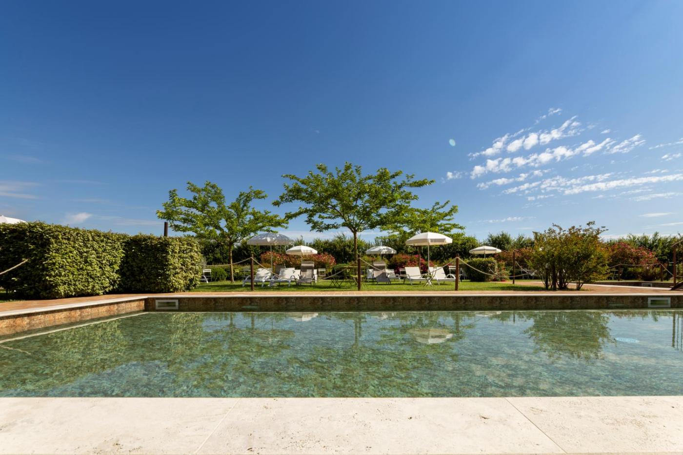 Camera Tripla Deluxe. Guests will have a special experience as this triple room provides a pool with a view. Offering free toiletries, this triple room includes a private bathroom with a shower, a bidet and a hairdryer. The spacious air-conditioned triple room offers a flat-screen TV with satellite channels, soundproof walls, a minibar, a tea and coffee maker as well as garden views. The unit offers 2 beds.